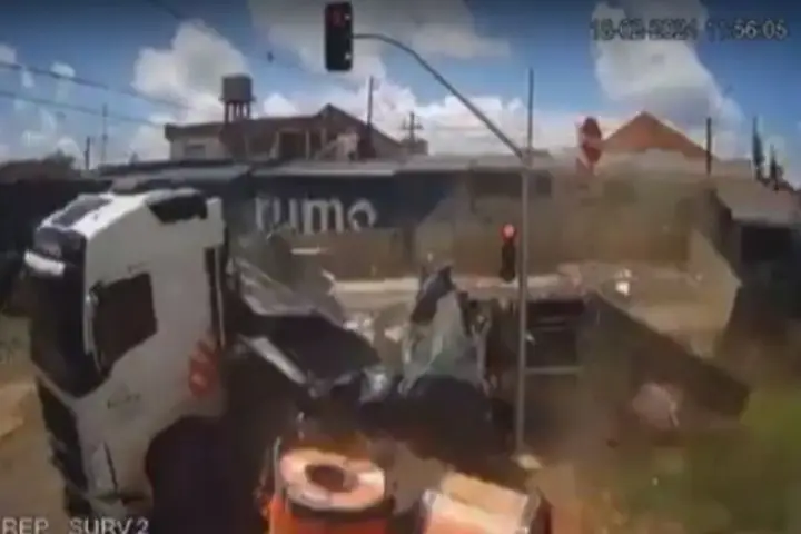 No vídeo, é possível ver que o sinal está vermelho e, mesmo assim, dois veículos cruzam a linha antes do caminhão também tentar passar. Entretanto, locomotiva parte o veículo em cheio e o arrasta por vários metros, causando ferimentos leves no condutor.