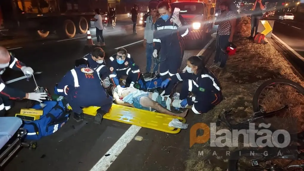 Uma moto seguia no sentido Maringá quando colidiu em um ciclista que atravessou a pista. Tanto o motociclista quando o ciclista caíram e tiveram de ser socorridos às pressas.