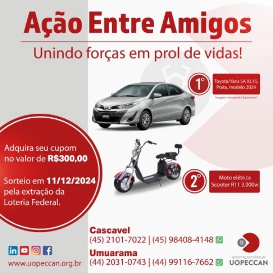 O Complexo Hospitalar Uopeccan deu início a sua campanha anual de arrecadação de recursos a: Ação Entre Amigos, que sorteará em 1º lugar um carro Toyota/Yaris SA XL15, prata, modelo 2024 e em 2º lugar uma moto elétrica scooter R11 3.000 watts.