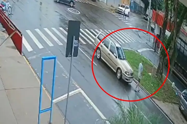 Pelas imagens é possível ver quando o idoso atravessa a avenida fora da faixa de pedestres. Um automóvel Parati, cor dourada, trafega pela via e acaba atingindo a vítima.