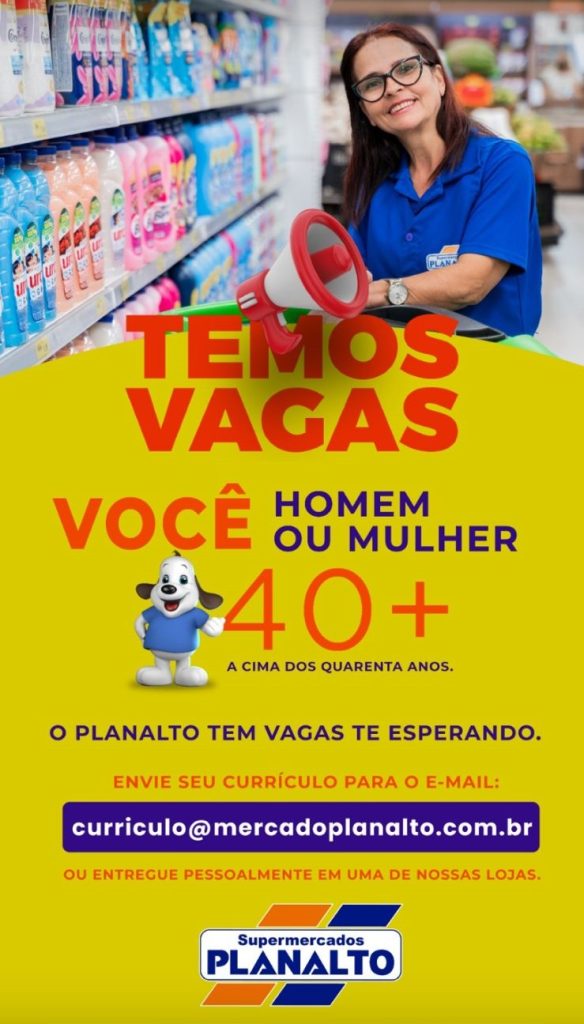 O Supermercados Planalto também divulgou que está com vagas para homens e mulheres acima dos 40 anos e que estejam à procura de emprego em Umuarama. Interessados podem enviar currículos para o e-mail curriculo@mercadoplanalto.com.br