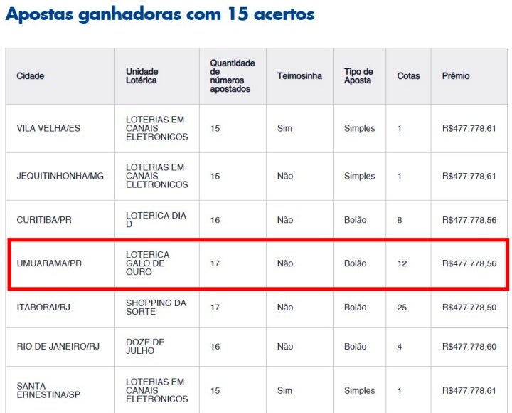 Os números do Concurso 3035 são: 1 – 5 – 7 – 8 – 9 – 12 – 13 – 14 – 17 – 18 – 20 – 21 – 23 – 24 – 25. A aposta em Umuarama foi feita na Lotérica Galo De Ouro e foram assinaladas 17 dezenas. O bolão teve 12 cotas. Desta forma, cada uma receberá R$ 39.814,88.