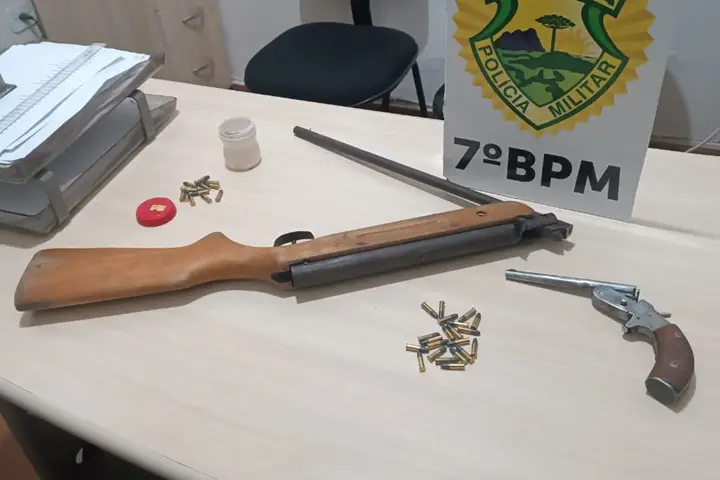 Além do armamento, que não tinha marca, também foi localizado em seu bolso 21 munições intactas calibre 22. Na residência do homem, em Moreira Sales, a PM localizou outra espingarda artesanal e 21 munições intactas.