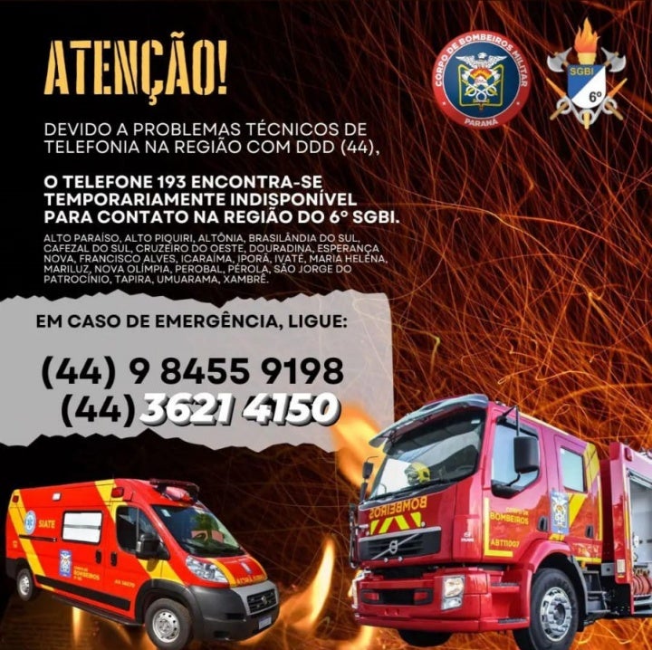 O Corpo de Bombeiros de Umuarama informa que devido a problemas técnicos de telefonia na região, o número de emergência 193 está temporariamente indisponível para contato com o quartel do 6º Subgrupamento.