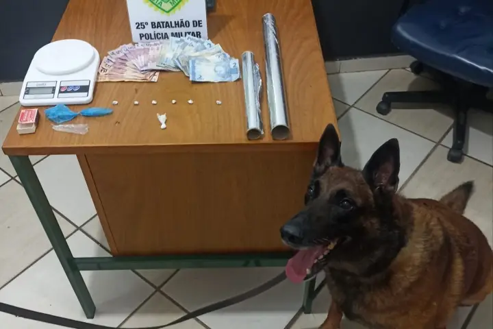 Em buscas no local com auxílio do cão de faro Iron, os policiais encontraram 6 pedras de crack e uma porção de 0,2 gramas de cocaína próximo à uma árvore no quintal da casa. Já no imóvel foi localizado uma balança de precisão, papel alumínio utilizado para embalar as pedras de crack, dinheiro trocado e uma embalagem azul para acondicionar drogas.