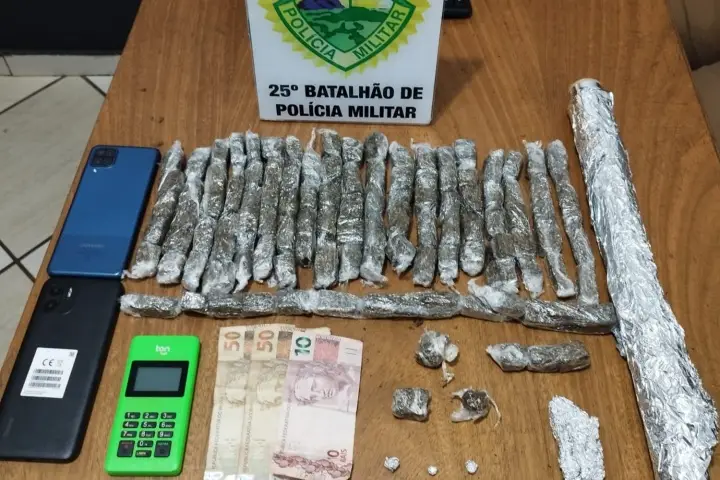 O suspeito de vender as drogas também foi abordado e estava em posse de 3 buchas de maconha. Já no imóvel, com auxílio do cão de faro Iron, a PM localizou aproximadamente 600 gramas de maconha fracionadas em 110 porções prontas para a venda; uma pedra de crack; um rolo de papel alumínio (utilizado para embalar as pedras) e uma máquina de cartão.