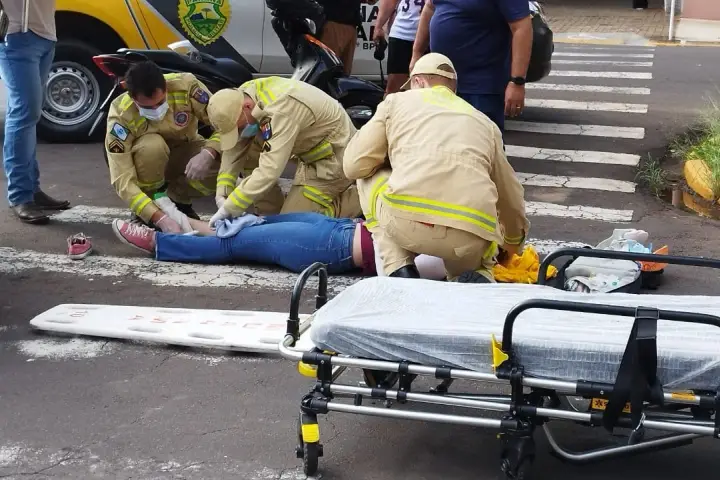 A condutora de uma Honda Biz, de 26 anos, ficou ferida, na tarde desta segunda-feira (4), após ser atingida por um VW Parati no cruzamento da avenida Maringá com a rua Cambé, no Centro de Umuarama. A condutora do automóvel afirmou que não enxergou a vítima se aproximando antes da colisão.