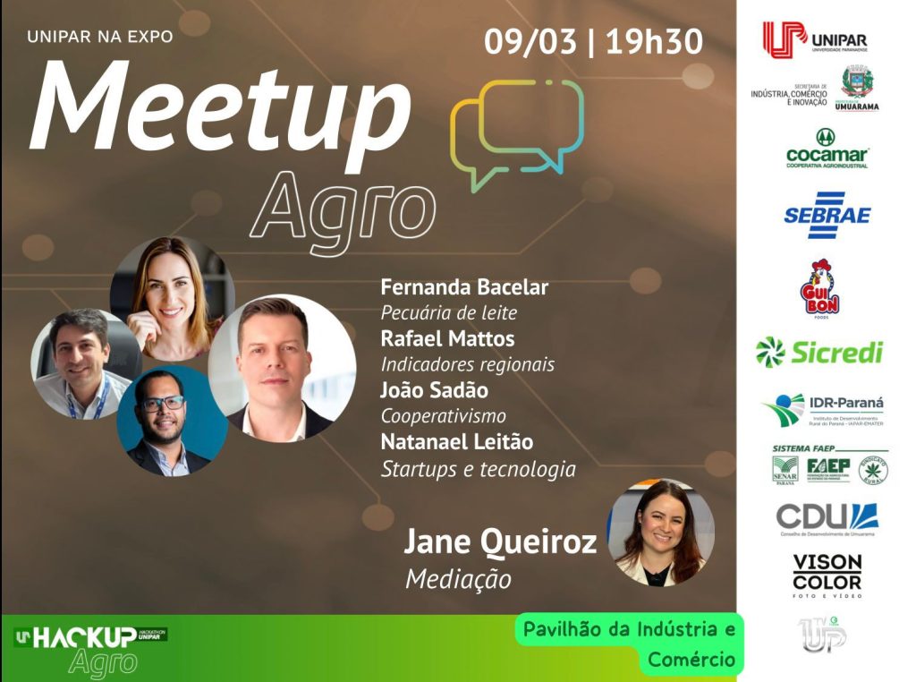 Para inaugurar a programação do Pavilhão da Indústria e Comércio na Expo Umuarama, a Unipar e a Secretaria de Indústria, Comércio e Inovação, com apoio do Sebrae, do IDR-PR, da Cocamar e da Avenorte, promovem neste sábado (9), o Meetup Agro, um encontro que reúne 4 especialistas do setor do agronegócio. A partir das 19h30, o evento abordará quatro assuntos: