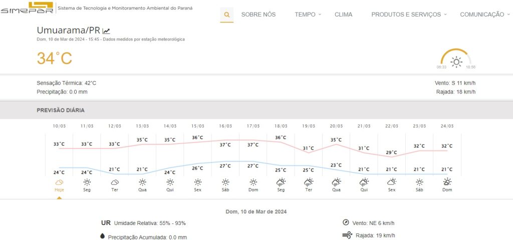 Em Umuarama, as temperaturas podem chegar aos 37ºC nos próximos dias. Segundo o Simepar (Sistema de Tecnologia e Monitoramento Ambiental do Paraná), elas ficam mais altas já a partir do dia 13, quando a máxima prevista é de 35 ºC. Depois, no dia 15, chega a 36 ºC e 37ºC no dia 17, voltando a cair a partir do dia 18. Neste domingo (10), a máxima prevista na capital do Noroeste é de 33 ºC.