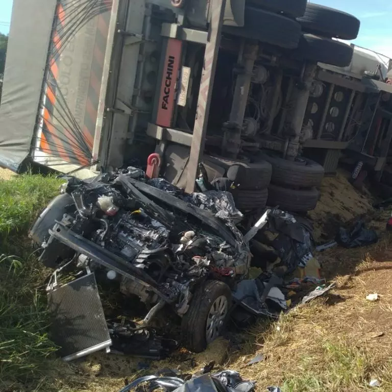 Uma carreta carregada de cevada tombou sobre um Volkswagen Polo na marginal da BR-277, em Guarapuava, resultando em três mortos e dois feridos. Três passageiros do carro morreram no local, enquanto uma adolescente de 12 anos, também no Polo, foi resgatada em estado grave.