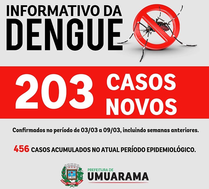 Com dados do boletim que acompanha a evolução da dengue referente à semana de 3 a 9 de março, divulgado nesta segunda-feira, 11, subiu para 456 o total de casos acumulados em Umuarama no atual ciclo epidemiológico (iniciado em 30/07/2023). Na última atualização foram 203 novos casos, sendo 41 positivos dentre as 171 notificações registradas na semana passada e casos de semanas anteriores que foram confirmados neste boletim.