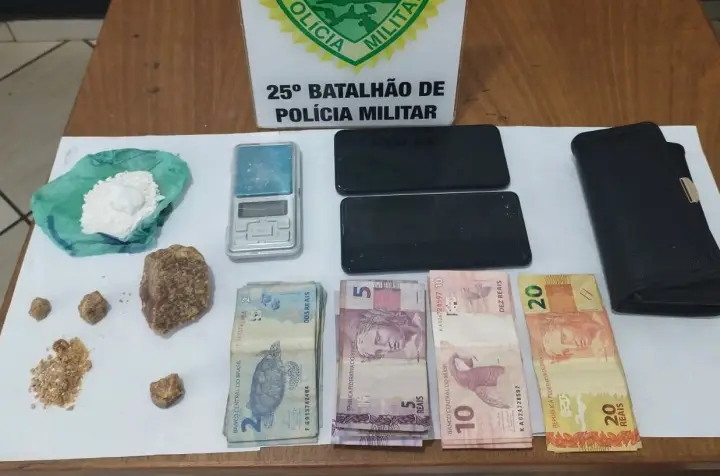 Os policiais receberam denúncias sobre a situação e foram realizadas diligências em uma residência do bairro. No baú de uma Honda/Biz, de cor branca, havia uma bolsa contendo 25,8 gramas de cocaína, 86,7 gramas de crack, uma balança de precisão, uma tesoura e R$ 208.