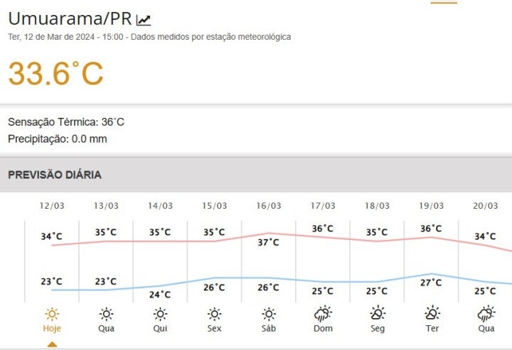 Em Umuarama, a temperatura pode chegar aos 37ºC no sábado (16). Segundo o Simepar (Sistema de Tecnologia e Monitoramento Ambiental do Paraná). Não há indicativo de chuva para a Capital da Amizade nos próximos dias. Confira abaixo a previsão do Simepar: