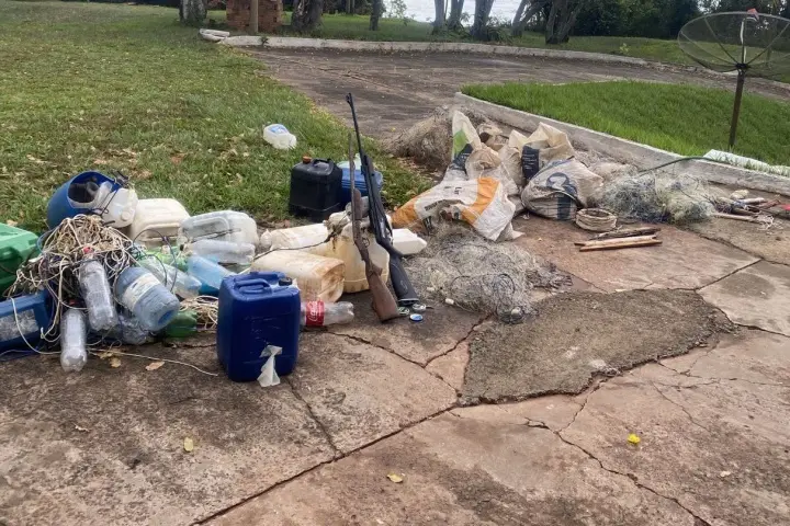 A equipe do IAT confiscou diversos materiais proibidos. Entre eles, rede de malha com 1.400 metros, 17 espinheis, 52 anzóis de galhos, 16 varas com molinete, 48 galões de ceva e quatro redes de emalhar com malhas de tamanho inferior ao permitido. Uma carabina de pressão e três frascos de munição também foram apreendidos.