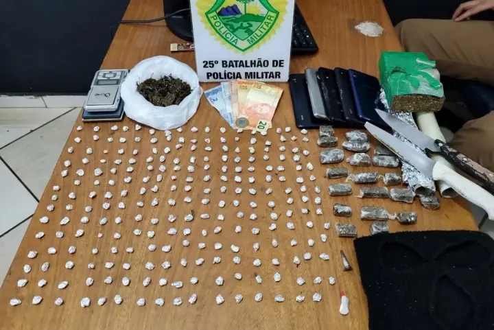 Logo depois os PMs foram até a residência de um dos abordados, no Ouro Branco. No imóvel foram descobertas em torno de 150 pedras de crack, 21 porções de maconha prontas para a venda, além de maconha em porções maiores, que ainda seria fracionada. Os militares também acharam 2 buchas de cocaína e diversos objetos utilizados no manuseio dos entorpecentes. Diante dos fatos, foram presos dois homens de 28 e 35 anos e uma mulher de 37 anos. Eles foram conduzidos para a Delegacia junto com todos os itens apreendidos.