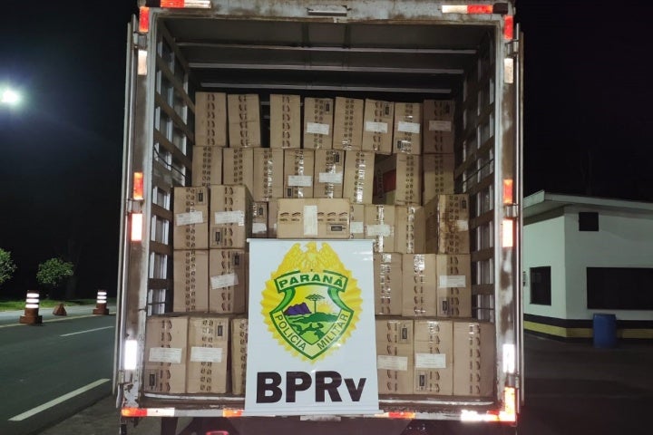Pelo chassi do veículo foi verificado que o caminhão estava com as placas trocadas e carregava 350 caixas de cigarros paraguaios, sendo 201 da marca Palermo e 149 da marca Rodeo.