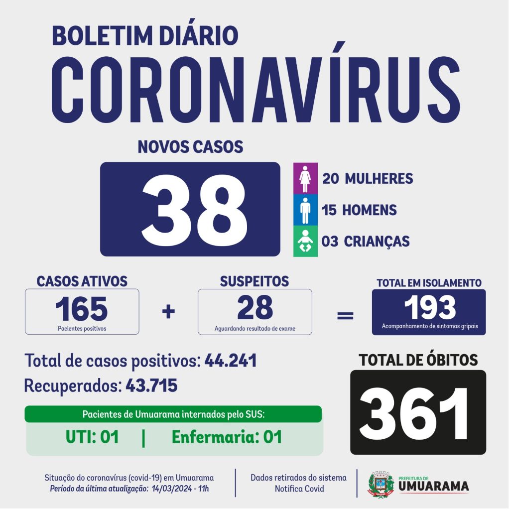 Desde o dia 1° de janeiro até esta quinta-feira, 14 de março (74 dias), os casos de covid-19 em Umuarama já atingiram a marca de 887 – 551 mulheres, 300 homens e 36 crianças. Mais 38 novos casos foram anunciados no Boletim Covid de hoje, sendo 20 mulheres, 15 homens e três crianças, totalizando 355 casos em março de 2024.