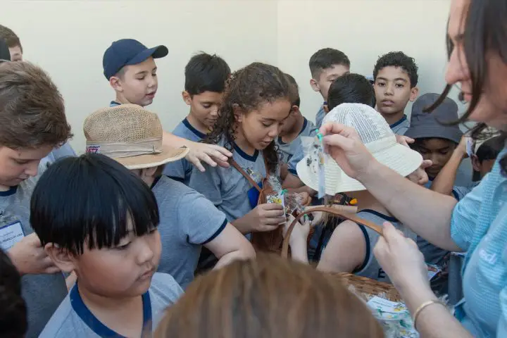 Em visita a exposição, crianças de escolas municipais estão recebendo sementes de crotalária