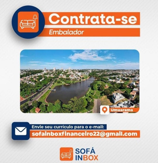 A Sofá Inbox de Umuarama também divulgou que está com uma vaga para embalador. Interessados devem enviar currículo para o e-mail sofainboxfinanceiro22@gmail.com ou entregá-lo diretamente na unidade, que fica na Av. Brasil, 2621, na Zona VII de Umuarama.