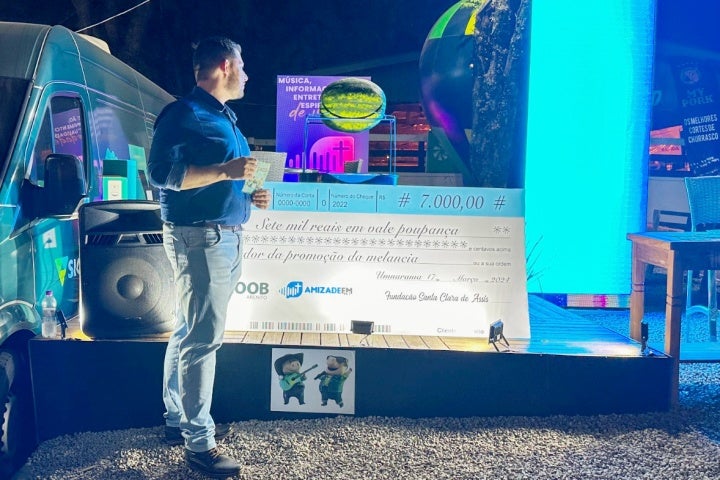 A promoção é da rádio Amizade FM e da cooperativa de crédito Sicoob Arenito. A melancia fica exposta no estande e os apostadores ganham um folder com um QR code para acessar a página onde vai escrever seu palpite. O apostador que acertar ou chegar mais perto do número ganha o prêmio. Se houver empate, será dividido.
