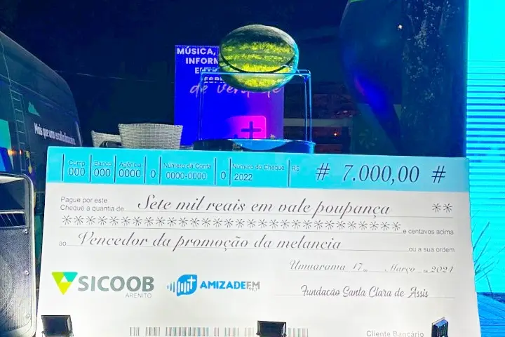 A promoção é da rádio Amizade FM e da cooperativa de crédito Sicoob Arenito. A melancia fica exposta no estande e os apostadores ganham um folder com um QR code para acessar a página onde vai escrever seu palpite. O apostador que acertar ou chegar mais perto do número ganha o prêmio. Se houver empate, será dividido.