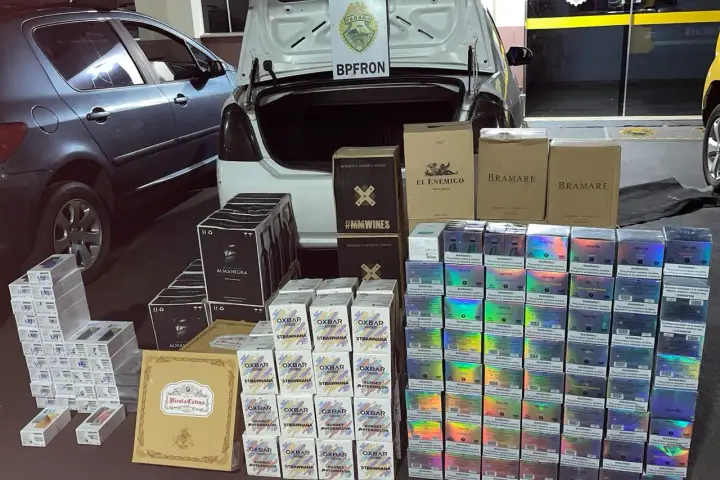 Em vistoria ao veículo, os policiais encontraram vinhos argentinos e celulares que totalizavam aproximadamente R$ 115 mil em descaminho.