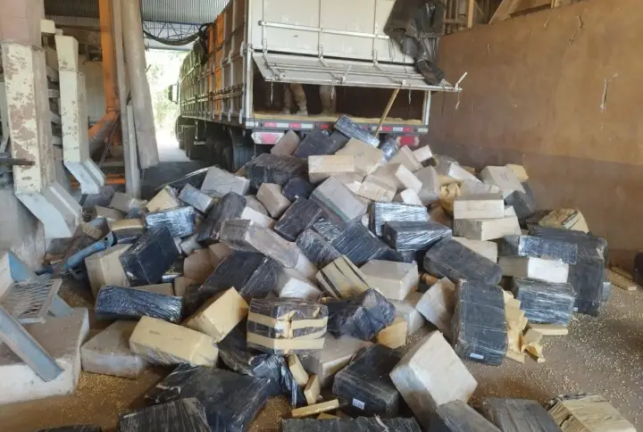 Após descarregada a soja, os policiais encontraram os 5.800 quilos de Maconha dispostos em fardos, que foram dissimilados em meio à carga de soja.