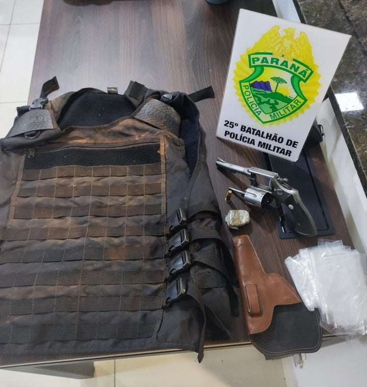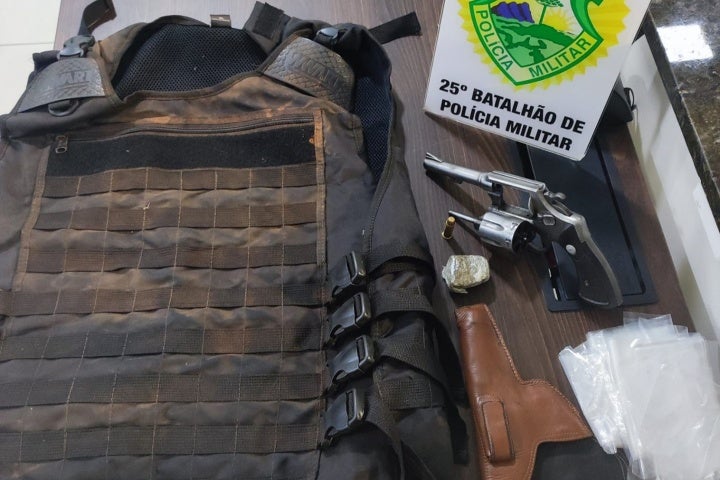 Dentro da casa, a PM realizou buscas e encontrou, em um colchão embaixo do quarto do casal, um revólver calibre .38 com uma munição intacta. Também foi encontrado uma capa para colete balístico e uma porção de 18 gramas de maconha.