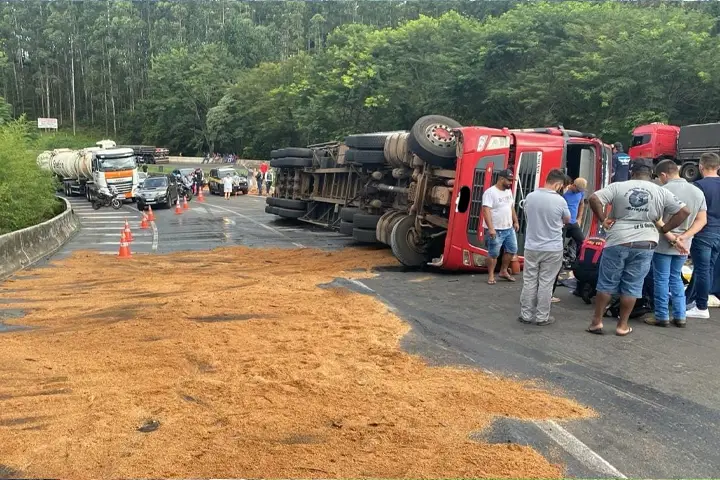 Um caminhão carregado de cerveja tombou no km 307 da BR-376, em Mauá da Serra, norte do Paraná, na tarde deste domingo (17). O motorista, 66 anos, perdeu o controle do veículo, que tombou na faixa da esquerda.