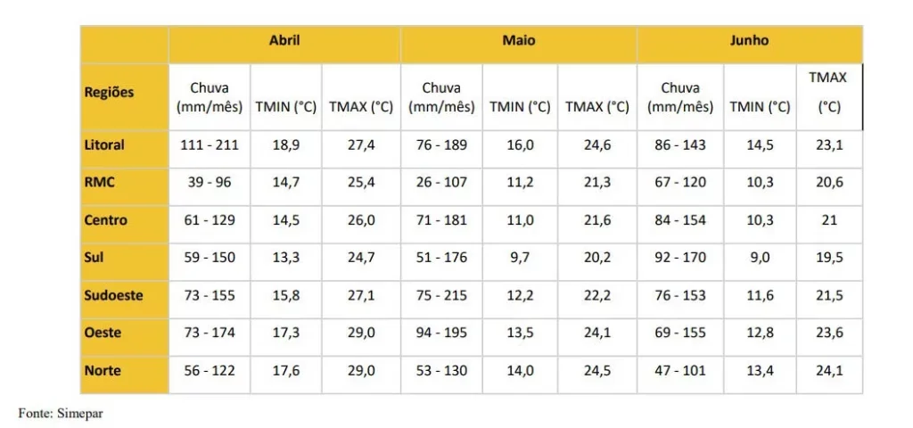 Confira os valores médios históricos de chuva (faixa de variação), temperaturas do ar mínimas e máximas para cada região do Paraná nos meses de abril, maio e junho: