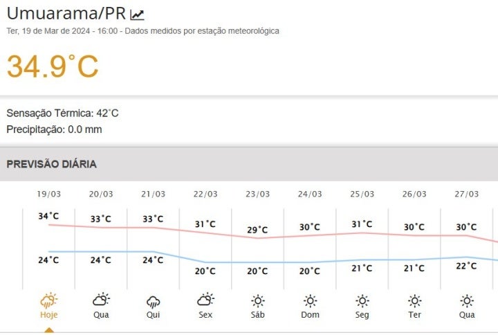 O último dia do verão está sendo de bastante calor em Umuarama. Nesta terça-feira (19) o instituto de meteorologia Simepar registrou sensação térmica de 42ºC por volta das 16h. No mesmo horário a temperatura era de 34,9ºC.