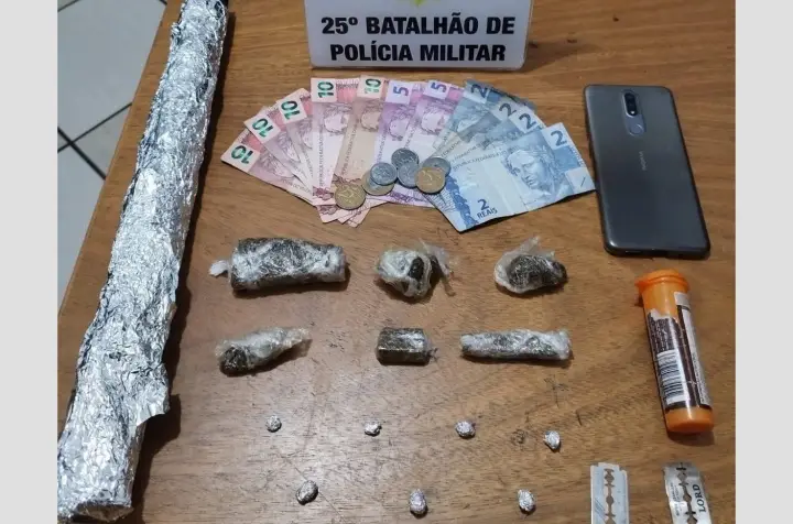 Em seguida, a equipe policial verificou a residência do jovem, onde foram encontrados mais entorpecentes. Ao todo, foram apreendidas 7 pedras de crack (pesando 1 grama), 5 porções de maconha (totalizando 24 gramas), além de uma porção maior, de 31 gramas. A maior parte das drogas estava fracionada e embalada, pronta para a venda.