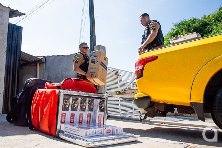 Na residência do suspeito, foram encontradas 15 caixas de cigarros, uma pasta contendo anotações e notas promissórias
