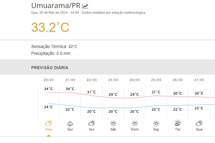O verão finalmente acabou, porém o calor ainda é predominante em Umuarama nesta quarta-feira (20), o primeiro dia de outono de 2024. De acordo com o Simepar (Sistema Meteorológico do Paraná), a máxima esperada para o dia é de 34°C, porém a sensação térmica na cidade no início da tarde atingiu incríveis 42°C.