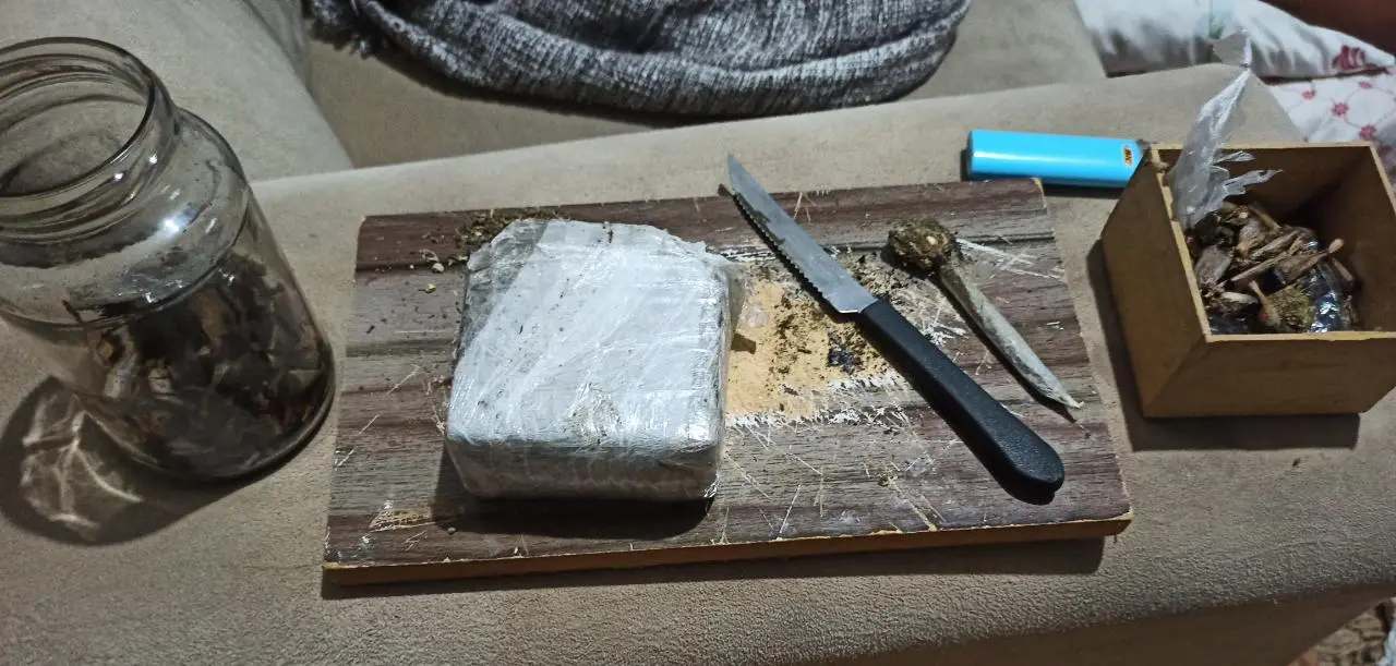 No local foi apreendido um tablete de 250 gramas do entorpecente e um cigarro de maconha.