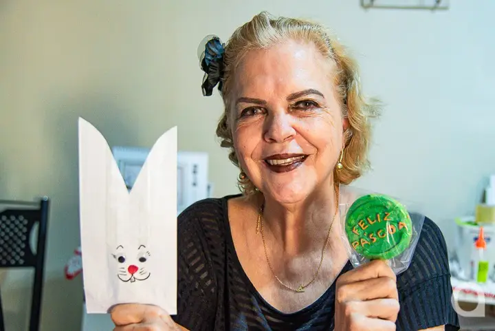 Ela acaba de criar as ‘caixinhas pedagógicas’ de Páscoa, voltadas para presentear as crianças. Essas caixinhas contêm biscoitos amanteigados em formato de coelho e cenoura, um tubete com granulado colorido, saquinhos de glacê [nas cores branca, alaranjada e verde] e miniovinhos de chocolate.