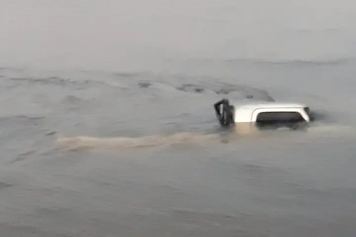 Uma caminhonete F-1000 foi parar dentro do rio Paraná, na tarde desta terça-feira (2), após um erro de cálculo durante uma manobra na rampa de desembarque em Balneário Vila Yara, em Altônia.