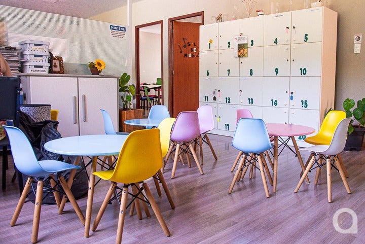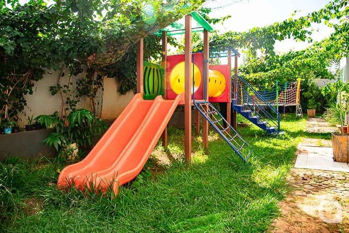 Entre os ambientes estão biblioteca, brinquedoteca, refeitório [com cozinha] e salas de audiovisual, de música, de karatê e de oficinas; também tem um campinho de futebol com arquibancada e um parquinho com cama elástica, escorregador, balanço e casa de boneca.
