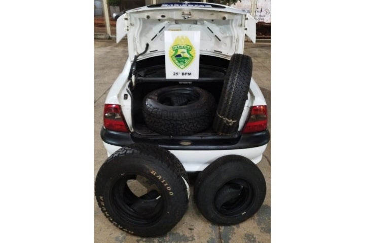 A Polícia Militar (PM) apreendeu, na noite desta quinta-feira (11), um veículo que estava carregado com 37 pneus sem procedência, em uma residência no Parque Industrial, em Umuarama. O dono da casa, de 35 anos, afirmou que receberia uma quantia em dinheiro para manter o veículo com os pneus no local.