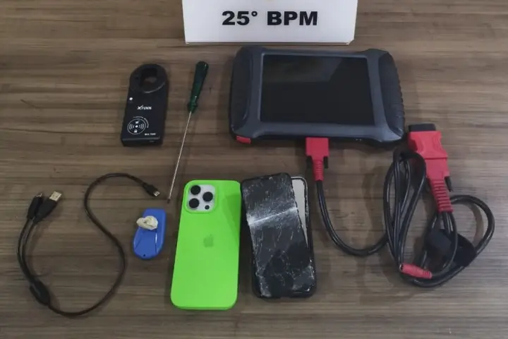 Em revista e inspeção à caminhonete, os policiais encontraram instrumentos utilizados para o furto, como um controle, transponder, uma chave de fenda e um chip – possivelmente todos utilizados para desativar o alarme do veículo e ligar o carro em “ligação direta”.