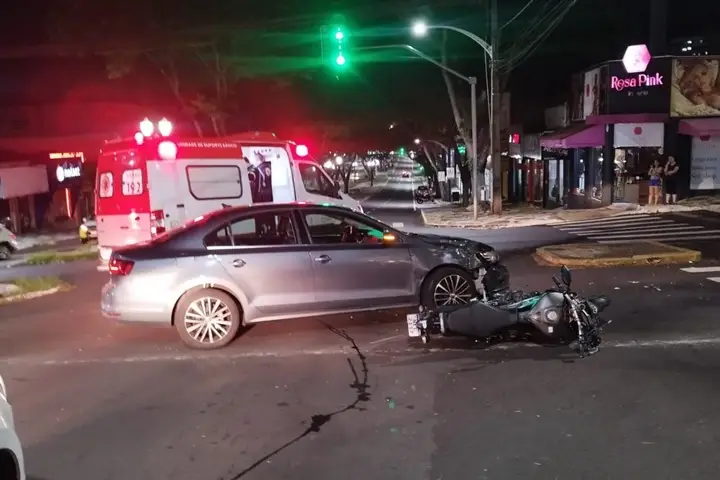 Um motociclista de 32 anos ficou ferido após se envolver em um acidente de trânsito na noite deste sábado (13), no cruzamento das Avenidas Paraná e Flórida, em Umuarama.