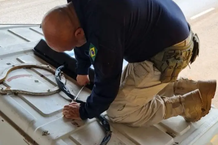 Desconfiando do comportamento do motorista, a equipe da PRF parou o veículo para verificação documental e de segurança viária. Durante a inspeção, foram encontrados 161,20 quilos de cocaína em barras. A abertura do compartimento do teto exigiu apoio do Corpo de Bombeiros para a remoção da tampa de acesso.