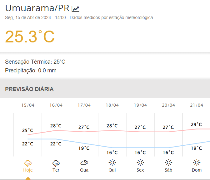 A partir de quarta-feira (17), o tempo começa a melhorar e as temperaturas devem variar de 19ºC a 27ºC em Umuarama. Na quinta-feira (18), o sol volta a brilhar na Capital da Amizade até o final de semana, e as temperaturas devem variar de 16ºC a 29ºC.