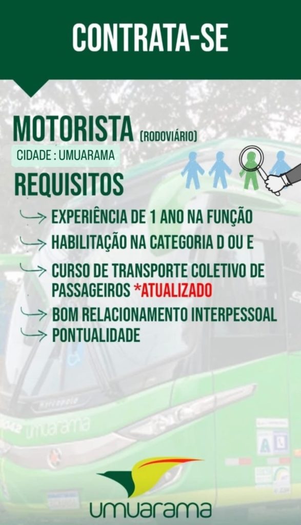 A Viação Umuarama também divulgou que está com uma vaga aberta para o cargo de motorista rodoviário, em Umuarama. Confira abaixo: