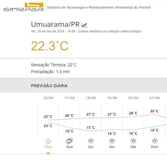 A temperatura se mantém bastante estável nesta terça-feira (16), em Umuarama. De acordo com o Simepar (Sistema Meteorológico do Paraná), os termômetros devem se manter entre a mínima de 23°C e a máxima de 25°C, o que, combinado ao tempo chuvoso, deve garantir um dia agradável aos umuaramenses.