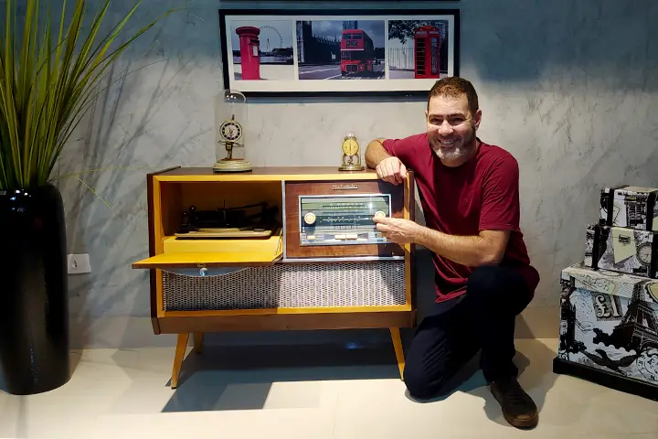 Decorada com toque vintage. Assim é a sala de estar da casa do arquiteto Cláudio Roberto Vieira, 53 anos. No centro da atenção estão uma vitrola e cinco rádios, de modelos cobiçados por colecionadores. Todos expostos com o cuidado e o brilho que merecem. E funcionando, já que foram restaurados. Cláudio entende da arte de “ressuscitar” aparelhos antigos e fez do hobby um jeito de empreender, oferecendo serviço de conserto.