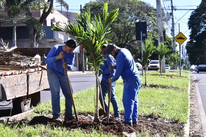 A Secretaria Municipal de Meio Ambiente iniciou, nesta quarta-feira (17), o plantio de 157 palmeiras veitchia merrillii na avenida Paraná, no trecho que fica entre o início da avenida Rio Grande do Sul (supermercado) e o trevo do shopping. A revitalização é especial para a festa do aniversário de Umuarama, comemorado em 26 de junho. O trabalho deve ser encerrado até o final da próxima sexta-feira (19).