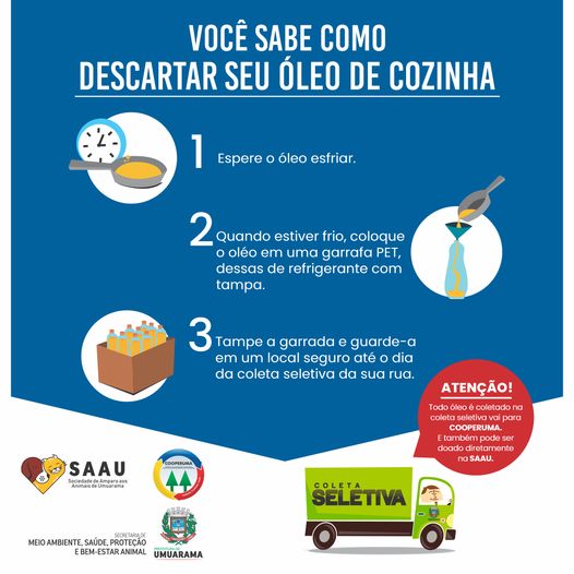 A Prefeitura de Umuarama, através da Secretaria de Meio Ambiente, Saúde, Proteção e Bem-estar animal, emitiu um informativo com instruções para o descarte correto do óleo de cozinha que sobra das panelas após o cozimento ou fritura de alimentos.