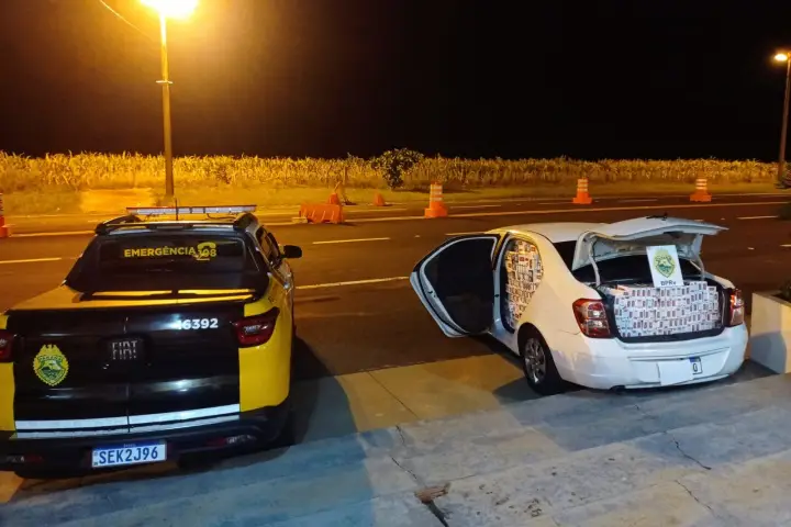 Ao todo, os policiais encontraram no bagageiro e no interior do veículo 20 caixas de cigarros da marca Eight, cobertos com pano de cor escura. Diante da situação, o veículo com os cigarros foi conduzido até o posto policial rodoviário de Iporã e, na sequência, para a delegacia da Receita Federal em Guaíra. Já o motorista não foi localizado.