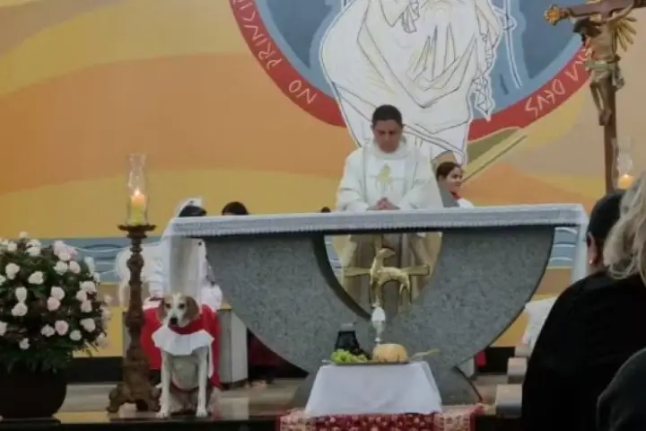 O cachorrinho Jhonny, acolhido pelo padre Luiz Paulo Soares na Paróquia Santa Ana e São Joaquim, em Barretos, interior de São Paulo, desde 2021, conquistou fiéis com sua presença constante durante as celebrações religiosas.